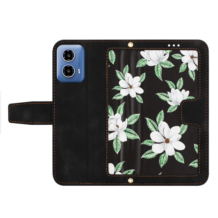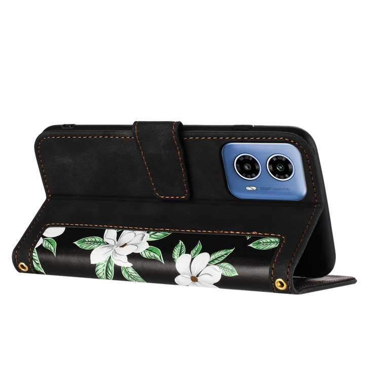 Funda de Cuero con Estampado Floral y Cordón para Motorola Moto G 5G (2024) (Negro)