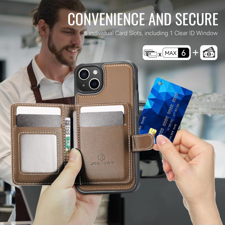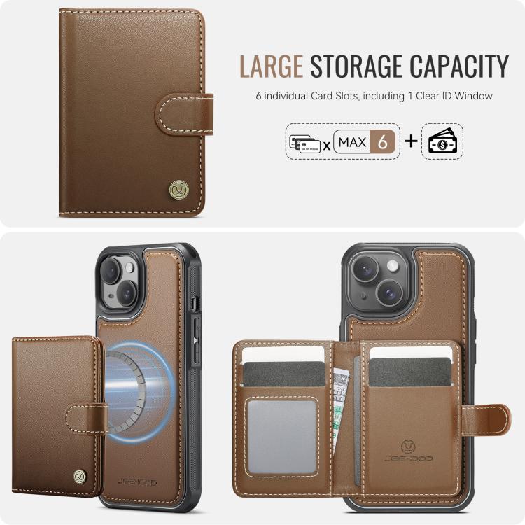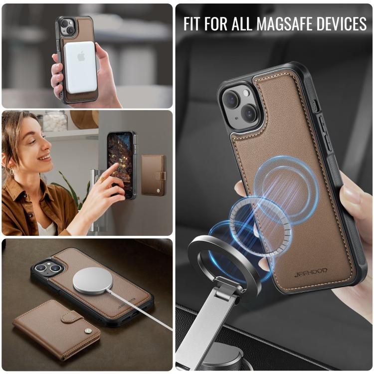 Funda de cuero con hebilla magnética para iPhone 14 JEEHOOD J09, con RFID y MagSafe (marrón)