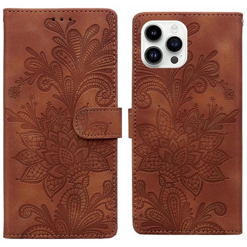 Funda de Cuero para iPhone 14 Pro con Hebilla Magnética y Diseño Floral en Relieve (Marrón)