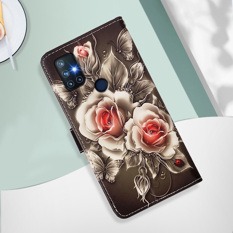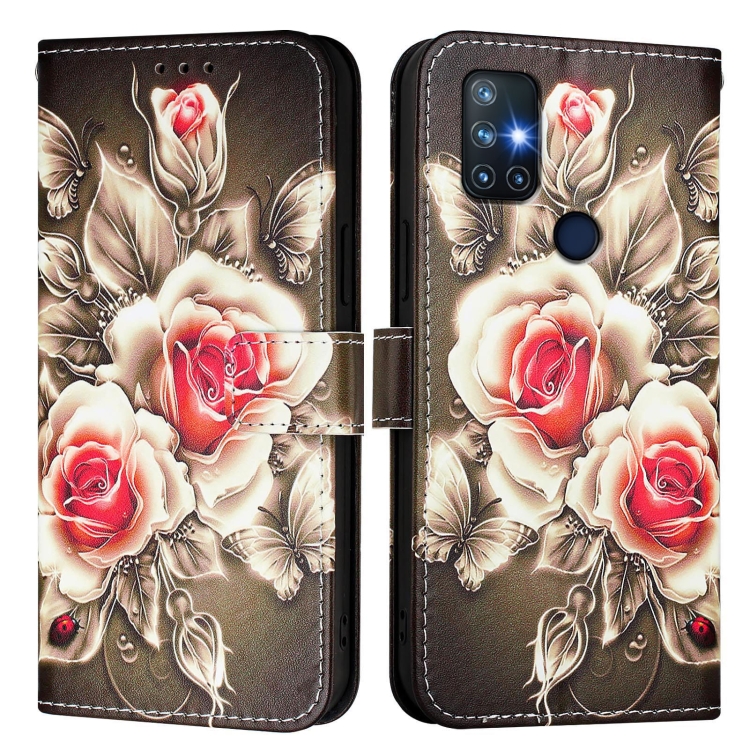 Funda de Cuero para OnePlus Nord N10 5G con Patrón de Dibujo de Colores (Rosas Sobre Negro)