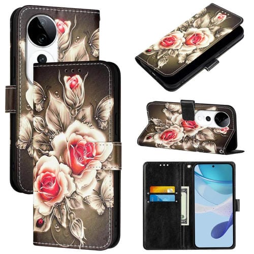 Funda de Cuero con Patrón de Dibujo de Colores para Vivo S19 Pro (Rosas Sobre Negro)