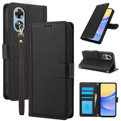 Funda de Cuero con Ranuras para Tarjetas y Doble Cordón para Oppo A17 4G Global/A17K Skin Feel Pure Color (Negro)