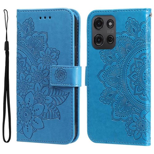 Funda de Cuero Motorola Moto G75 5G con Relieve de Flores de Siete Pétalos (Azul)