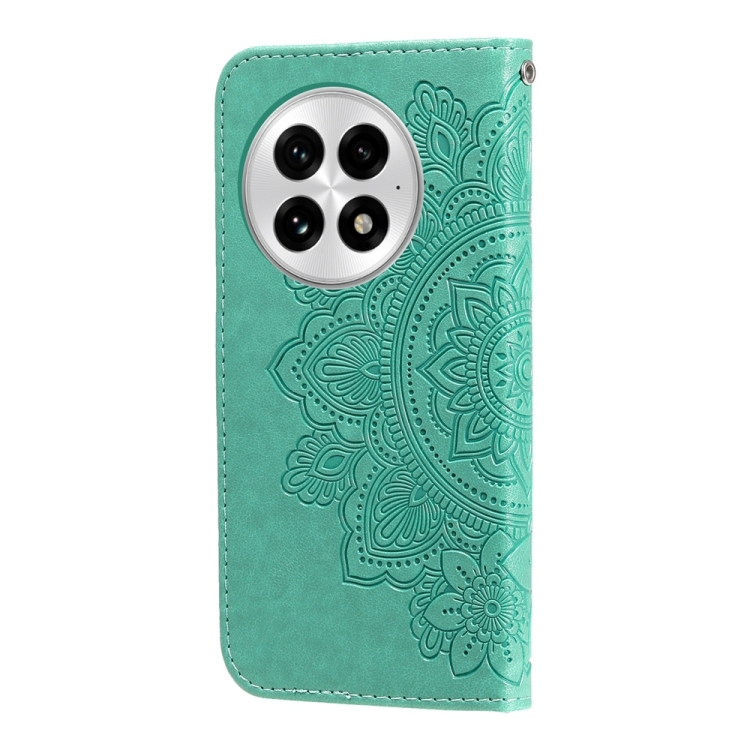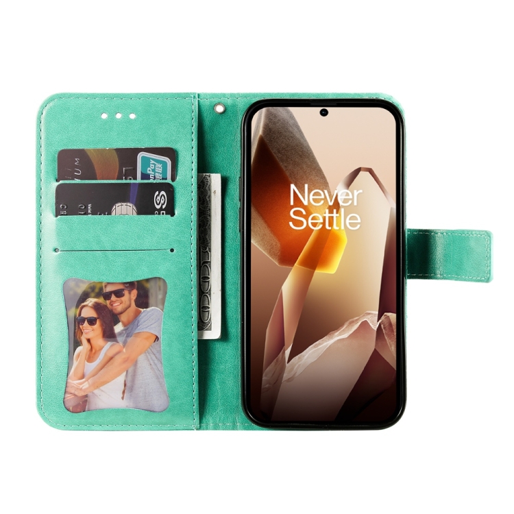 Funda de Cuero con Relieve Flores de Siete Pétalos para OnePlus 13 (Verde)