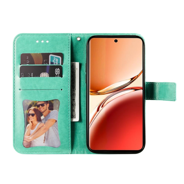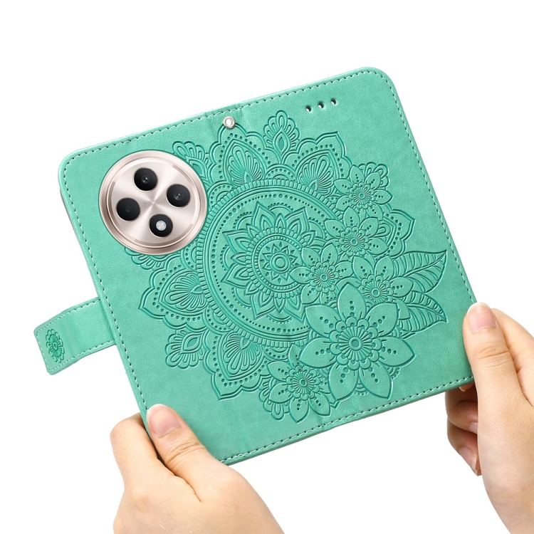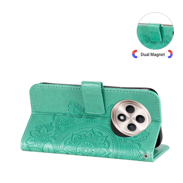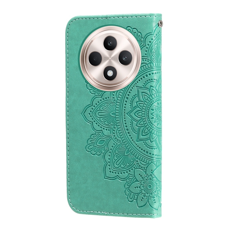 Funda de Cuero con Relieve de Flores de Siete Pétalos para Oppo Reno12 F 5G Global (Verde)