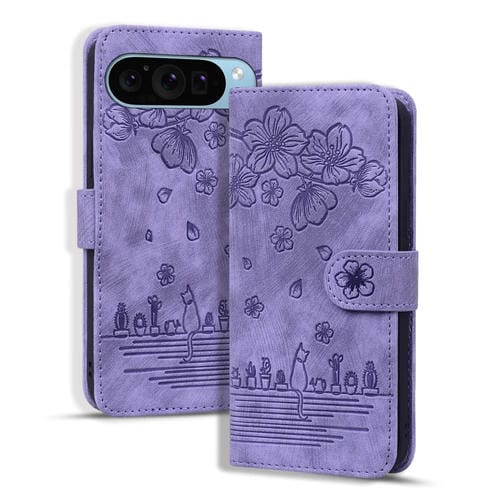 Funda de Cuero con Relieve de Gato Sakura para Google Pixel 9 y 9 Pro (Morado)