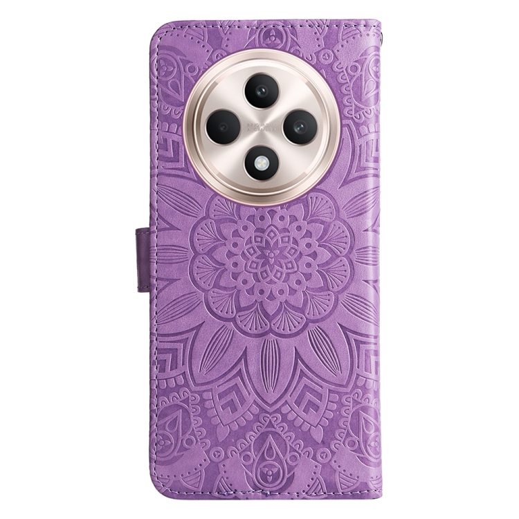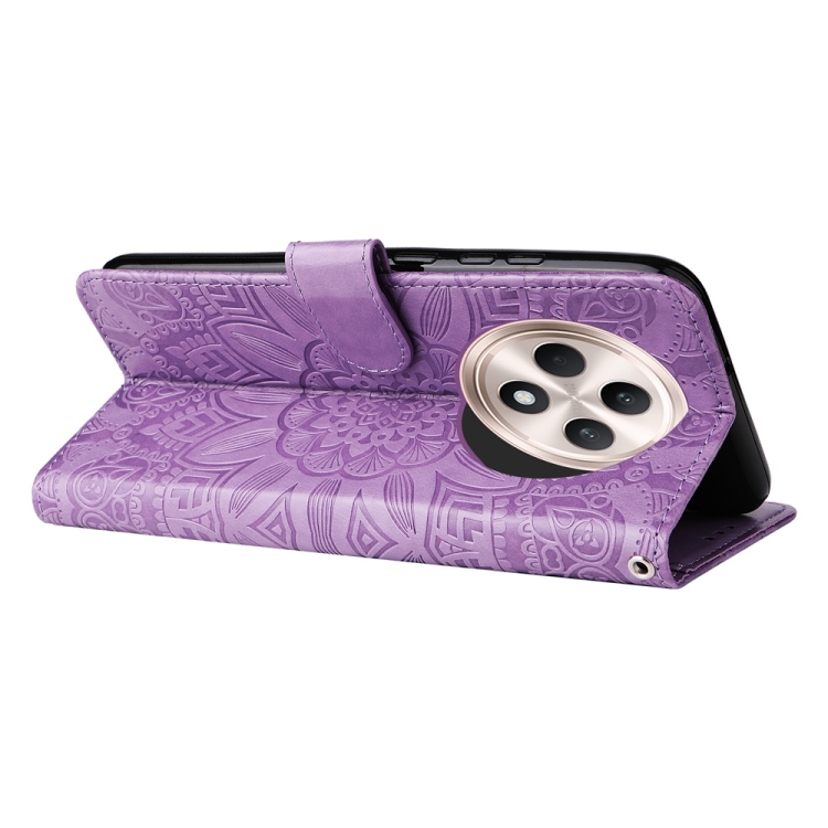 Funda de Cuero con Relieve de Girasol para Teléfono Oppo Reno12 F 5G (Morado)