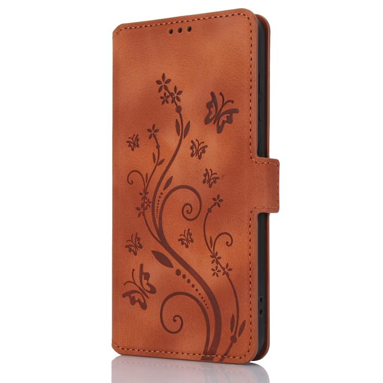 Funda de Cuero para iPhone 13 Mini con Relieve de Mariposa y Flor de Amor (Marrón)