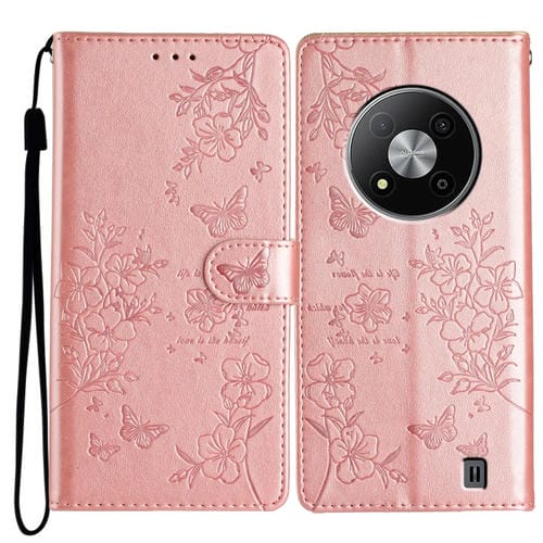 Funda de Cuero con Relieve Mariposa y Flor para ZTE Blade A73 5G (Oro Rosa)