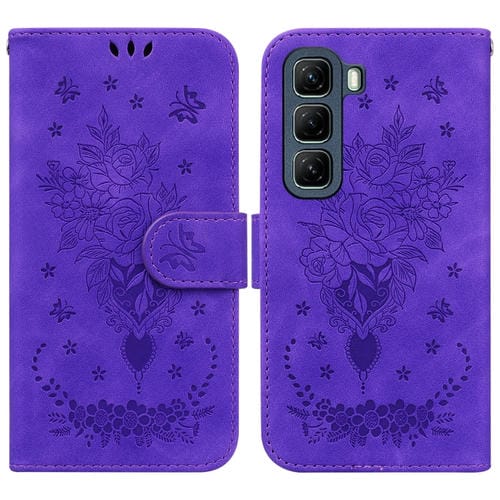 Funda de Cuero con Relieve Mariposa y Rosa para Infinix Hot 50 4G (Morado)