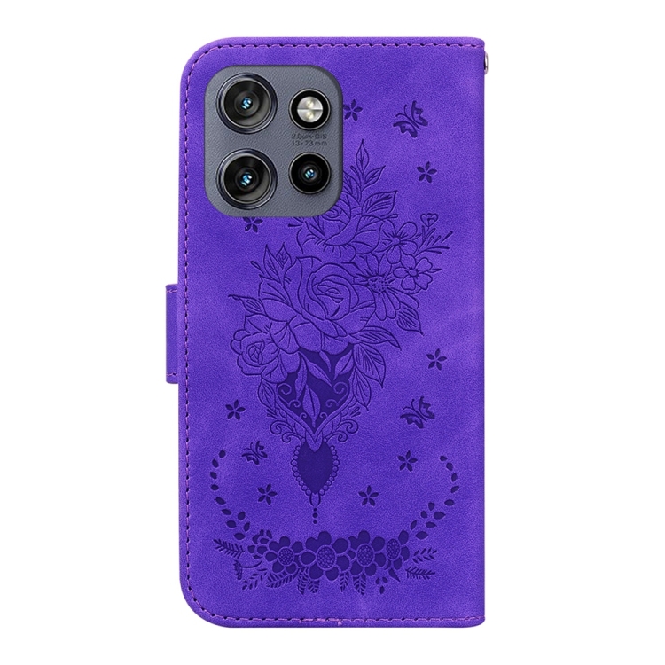 Funda de Cuero con Relieve Mariposa y Rosa para Motorola Edge 50 Neo 5G (Morado)