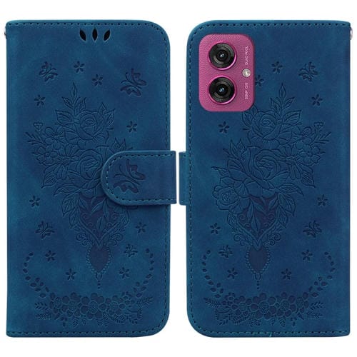 Funda de Cuero Motorola Moto G55 con Relieve Mariposa y Rosa (Azul)