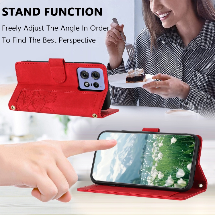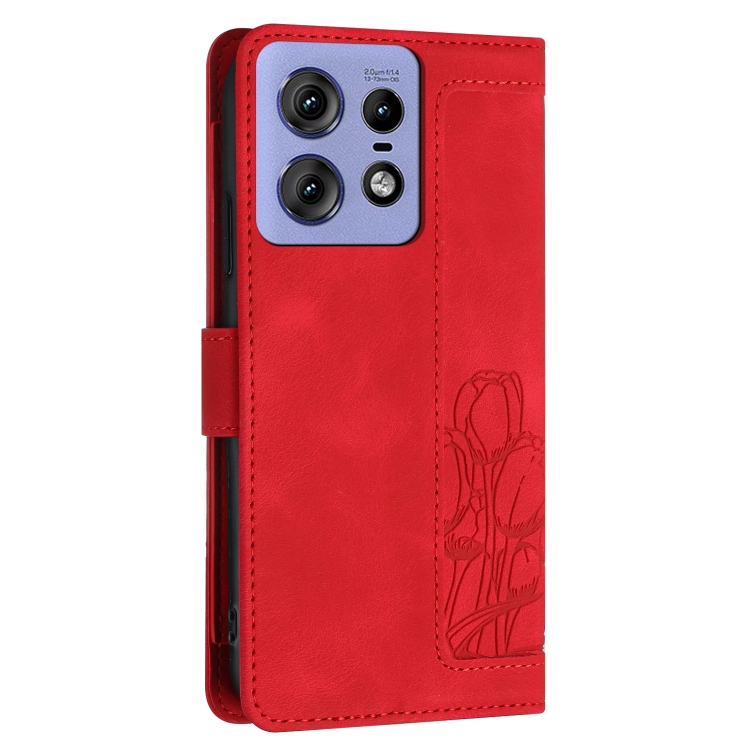 Funda de Cuero con Relieve de Tulipanes para Motorola Edge 50 Pro con Cordón (Rojo)