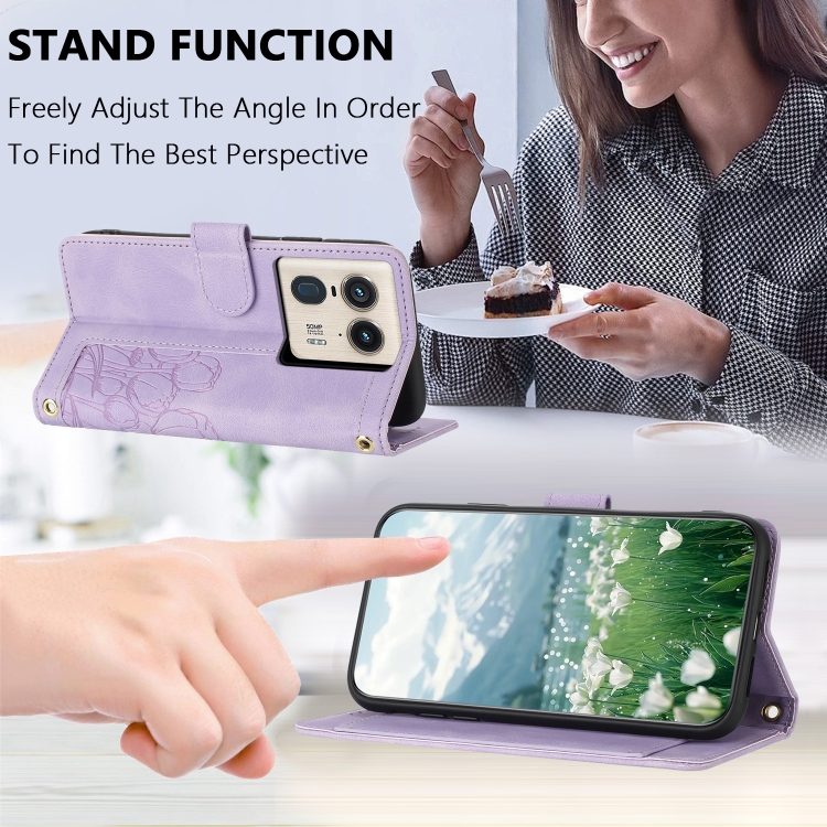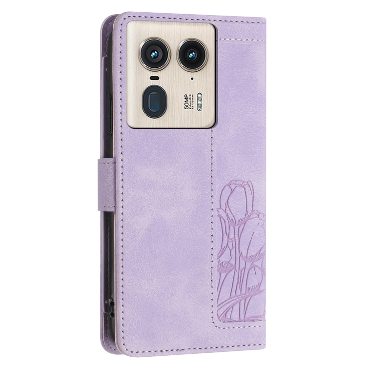 Funda de Cuero con Relieve de Tulipanes para Motorola Edge 50 Ultra con Cordón (Morado)