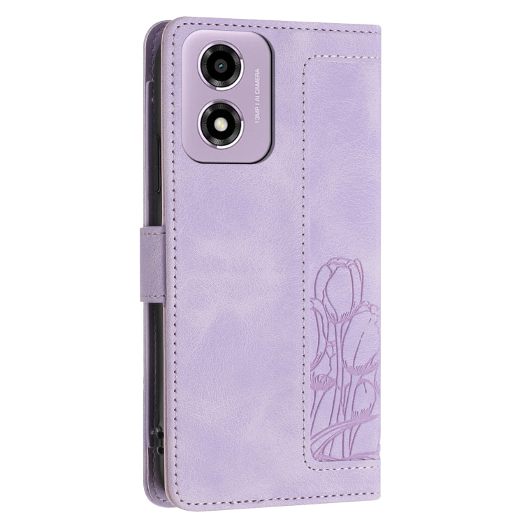 Funda de Cuero con Relieve de Tulipanes para Motorola Moto E14 con Cordón (Morado)