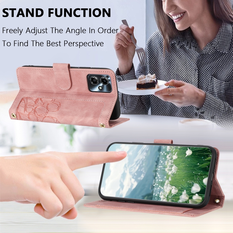 Funda de Cuero con Relieve de Tulipanes para Motorola Moto G14/G54 con Cordón (Rosa)