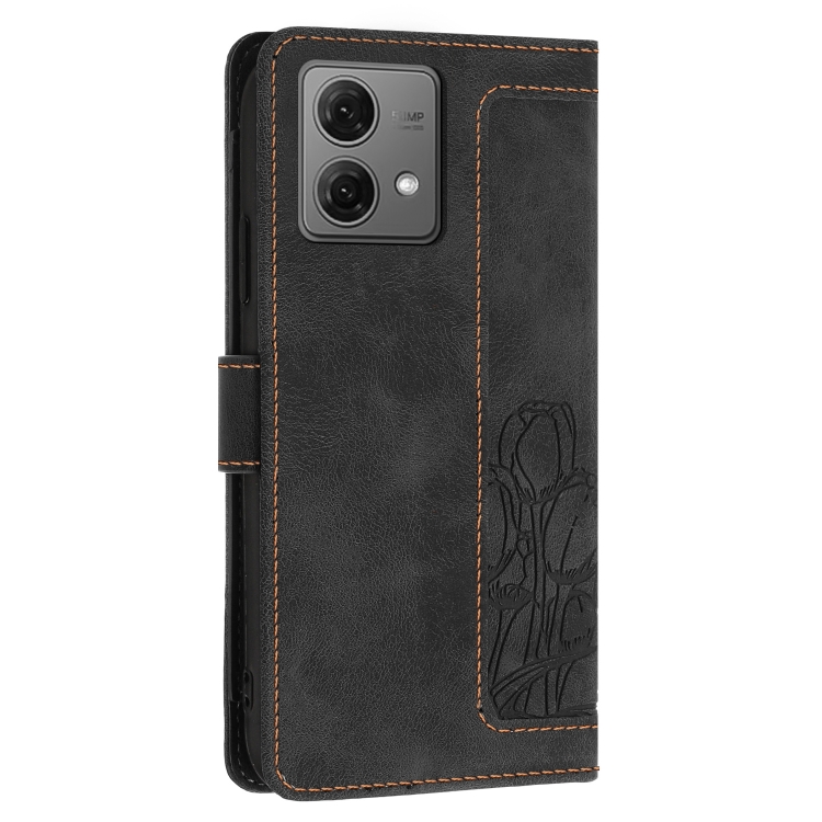 Funda de Cuero con Relieve de Tulipanes para Motorola Moto G84 con Cordón (Negro)