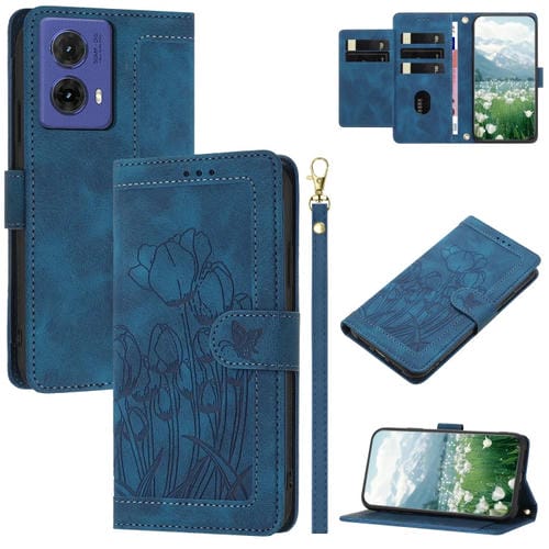 Funda de Cuero con Relieve de Tulipanes para Motorola Moto G85 con Cordón (Azul)
