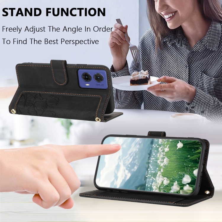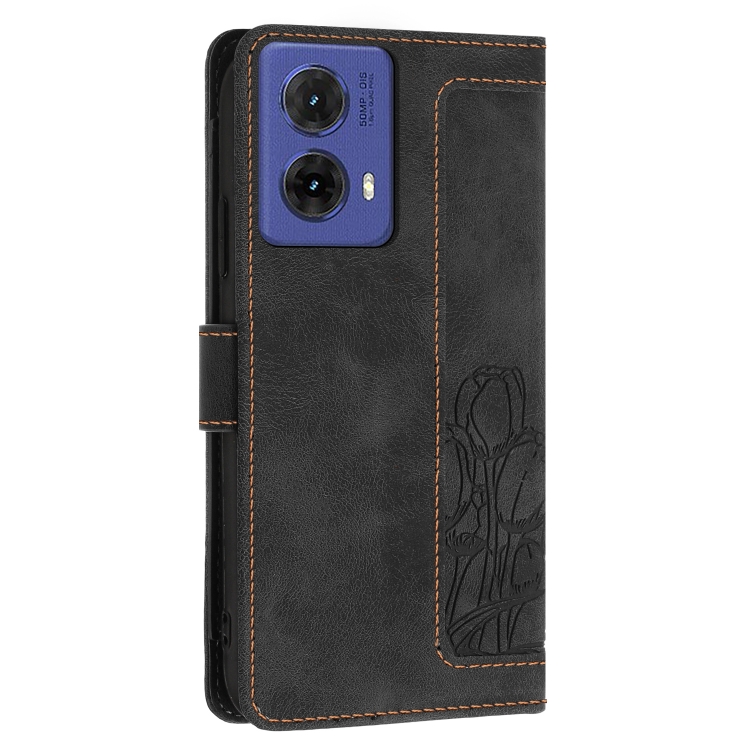 Funda de Cuero con Relieve de Tulipanes para Motorola Moto G85 con Cordón (Negro)