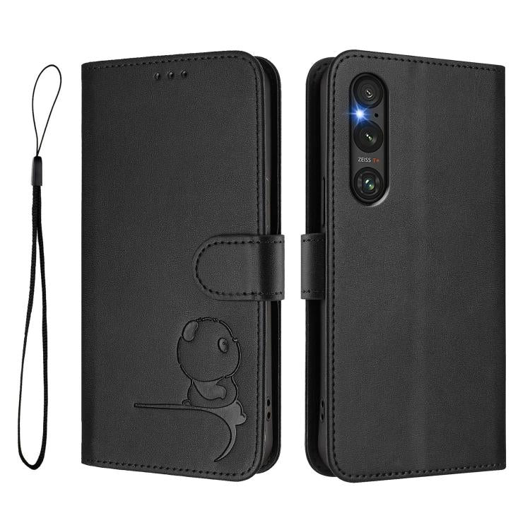 Funda de cuero con relieve RFID y cordón para Sony Xperia 1 V (negro)