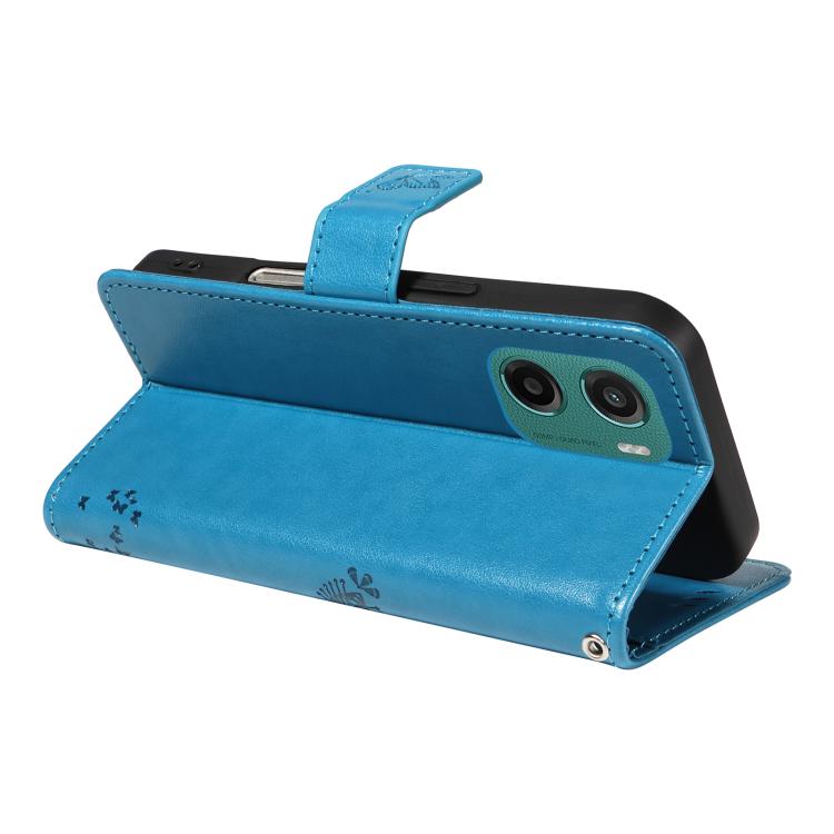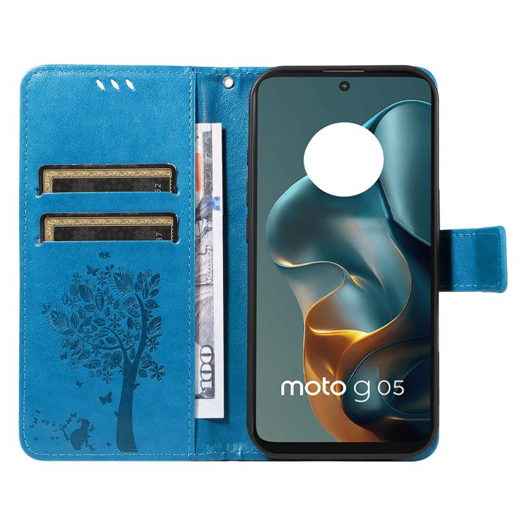 Funda de Cuero con Tapa para Motorola Moto G05 con Diseño de Árbol y Gato (Azul)