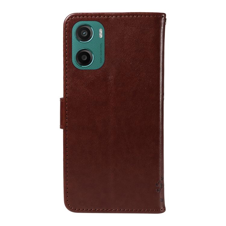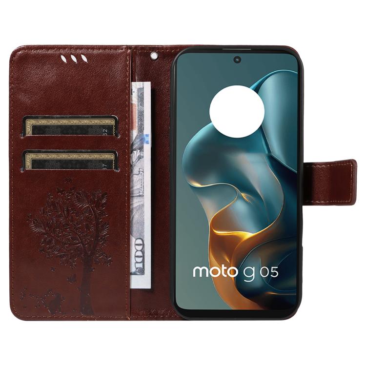Funda de Cuero con Tapa para Motorola Moto G05 con Diseño Árbol y Gato en Relieve (Café)