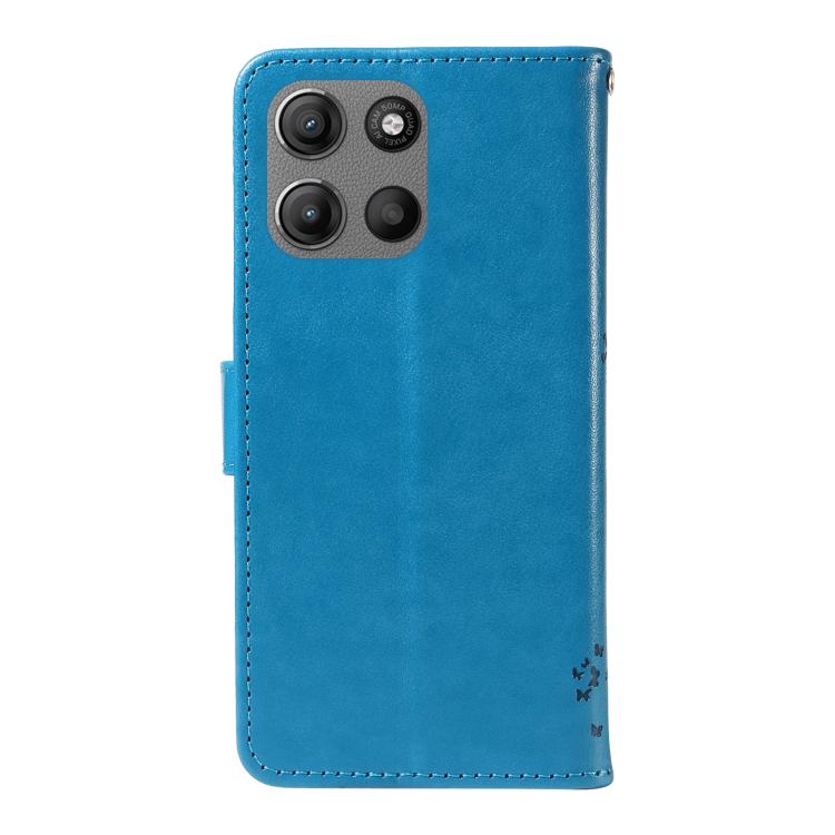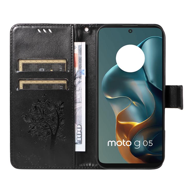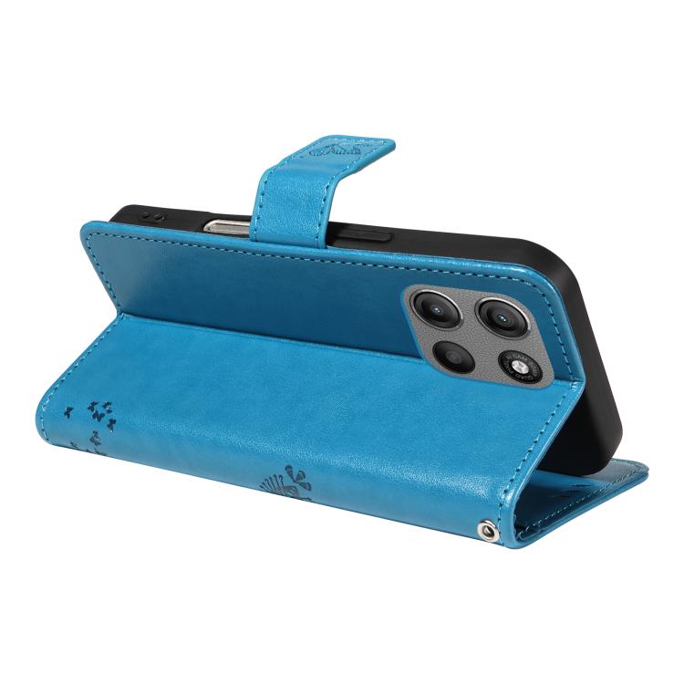 Funda de Cuero con Tapa para Motorola Moto G15 con Diseño Árbol y Gato en Relieve (Azul)