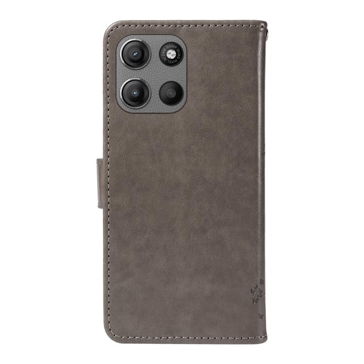 Funda de Cuero con Tapa para Motorola Moto G15 con Diseño de Árbol y Gato en Relieve (Gris)
