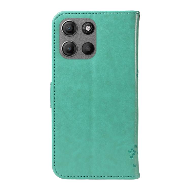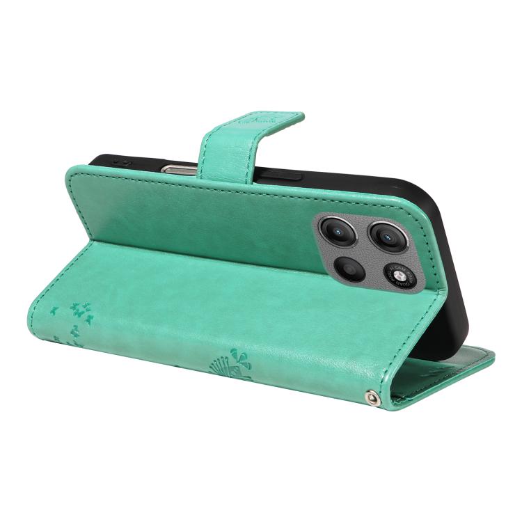 Funda de Cuero con Tapa para Motorola Moto G15 con Diseño Árbol y Gato en Relieve (Verde)