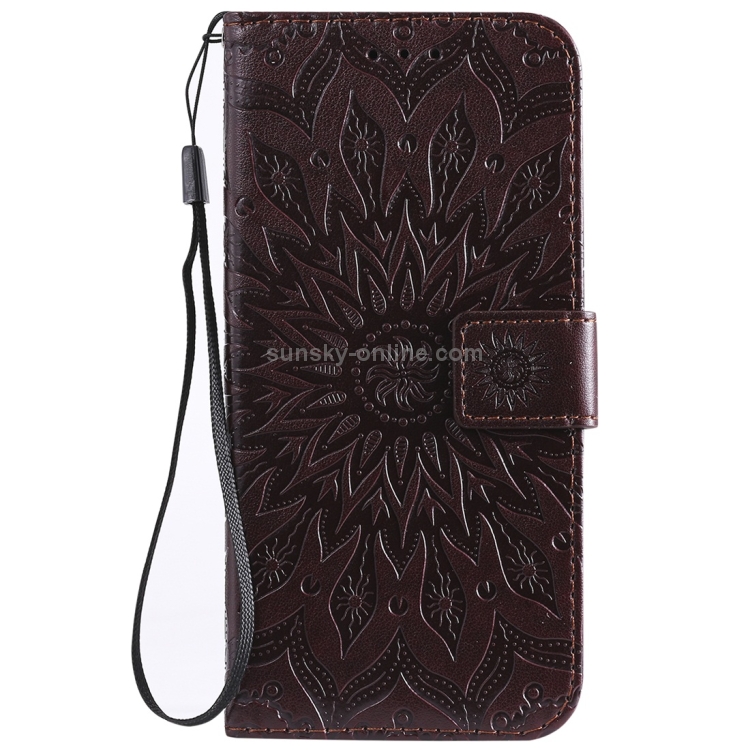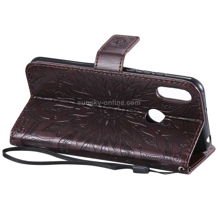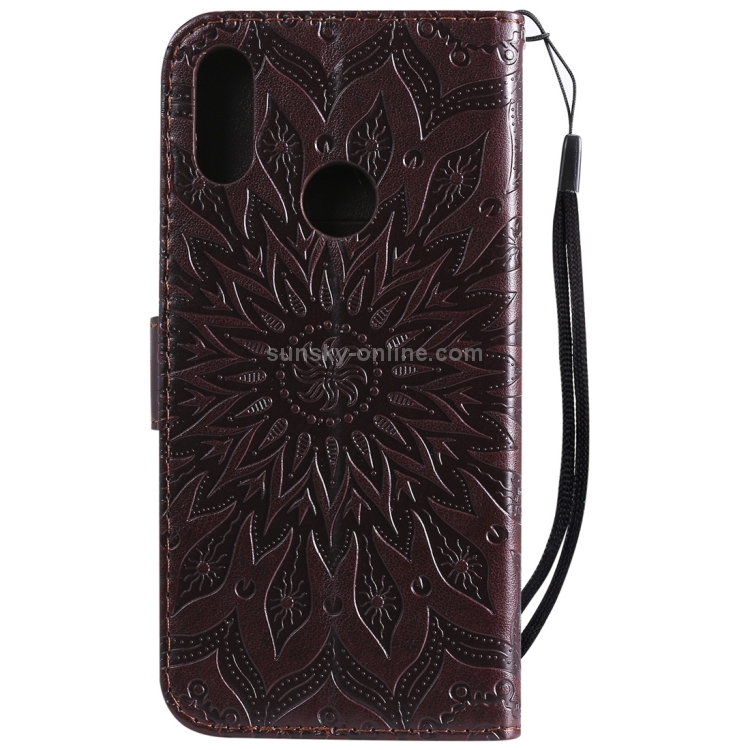 Funda de Cuero con Tapa Horizontal Estampado Sol para Huawei Honor Play 8A Y6 (2019) con Ranura Tarjeta Soporte Billetera Cordón (Marrón)
