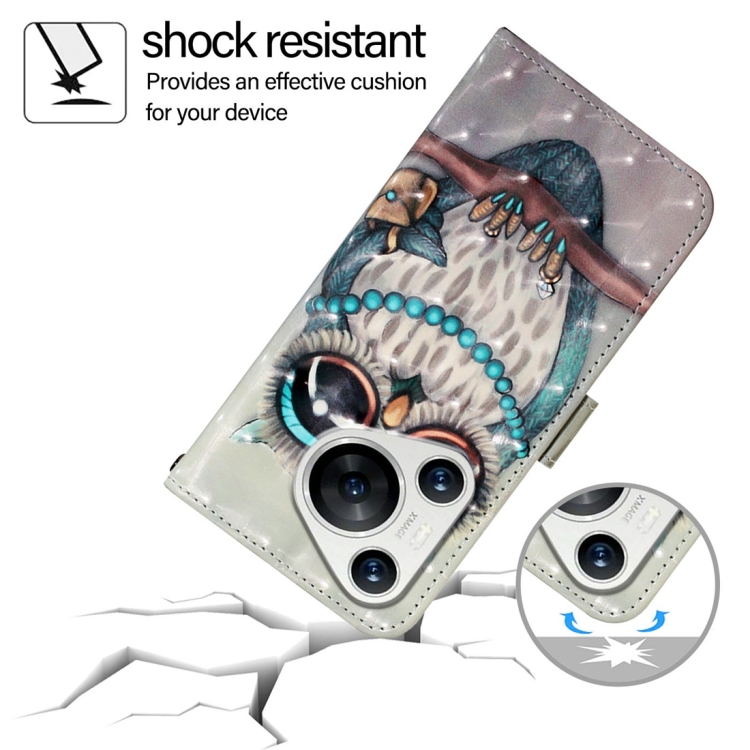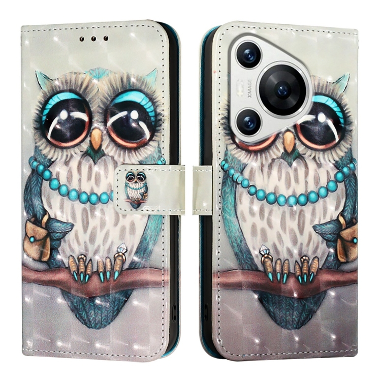 - 1x Funda de Cuero con Tapa Horizontal y Pintura 3D para Huawei Pura 70 (Búho Gris)