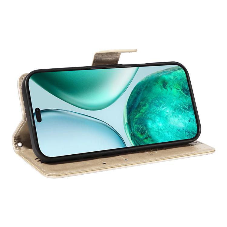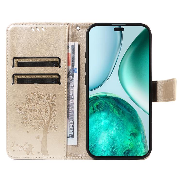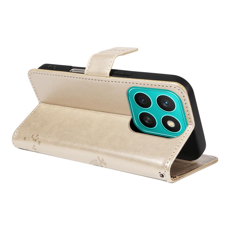 Funda de Cuero con Tapa para Honor X8C 4G Global con Estampado de Árbol y Gato (Dorada)