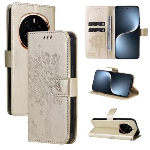 Funda de Cuero con Tapa para Honor Magic7 con Estampado de Árbol y Gato (Dorada)