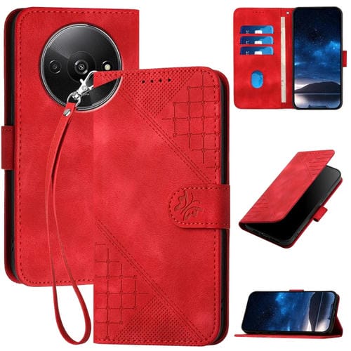 Funda de Cuero con Tapa y Cordón para Redmi A3 Yx0080 con Diseño En Relieve de Mariposa y Cuadrícula (Rojo)