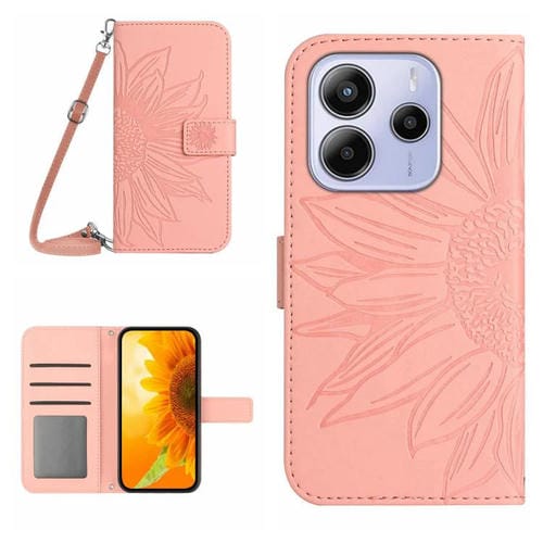 Funda de Piel con Tapa y Cordón para Redmi Note 14 4G (163,25mm), Diseño de Girasol En Relieve, Color Rosa