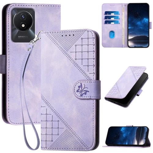 Funda de Cuero con Tapa y Cordón para Vivo Y11 2023 / Y02T Yx0080 con Diseño En Relieve de Mariposa y Cuadrícula (Morado Claro)
