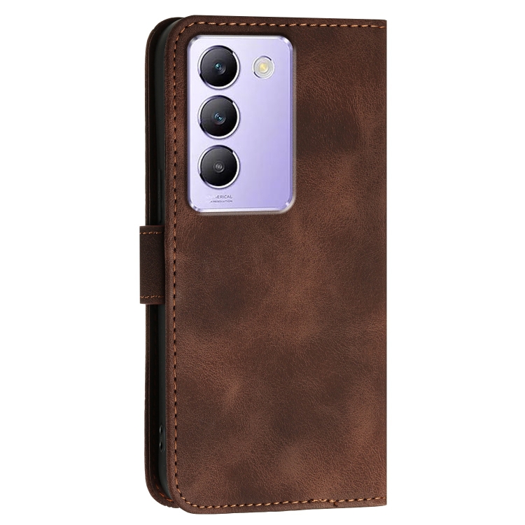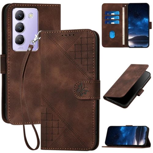 Funda de Cuero con Tapa y Cordón para Vivo Y200E 5G Global Yx0080 con Diseño En Relieve de Mariposa y Cuadrícula (Café)