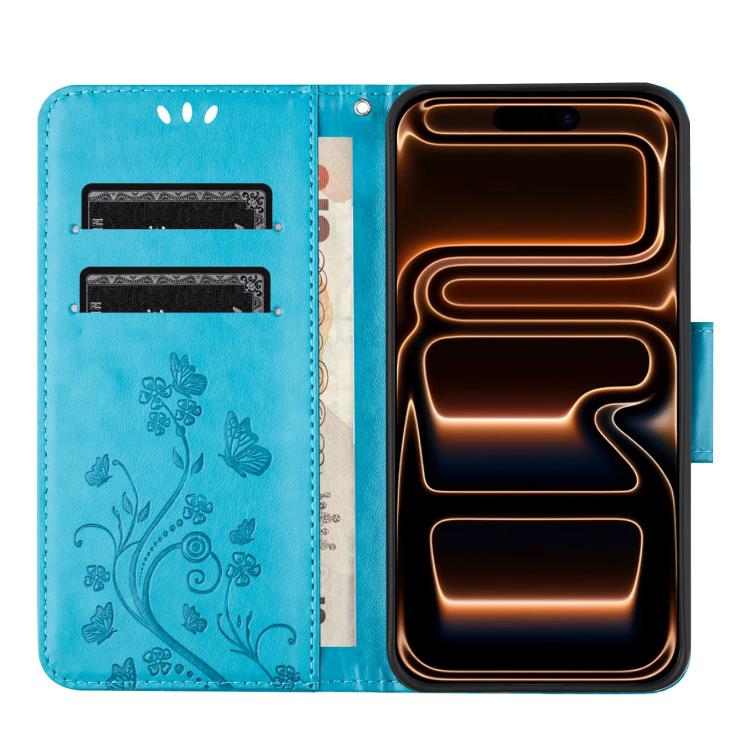 Funda de cuero con tapa y diseño de mariposas y flores para iPhone 17 Pro (azul)