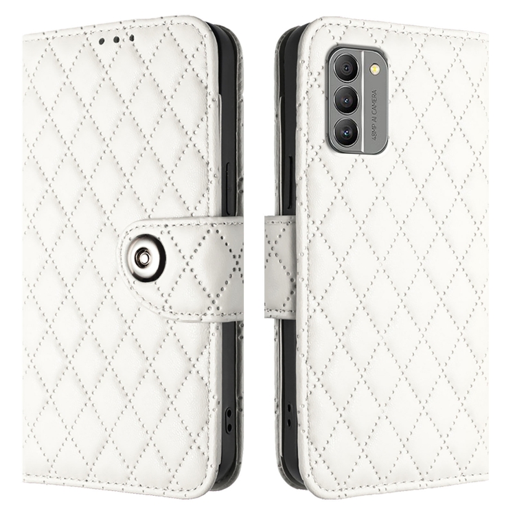 Funda de Cuero con Tapa y Textura Rombal para Nokia G400 con Cordón (Blanca)
