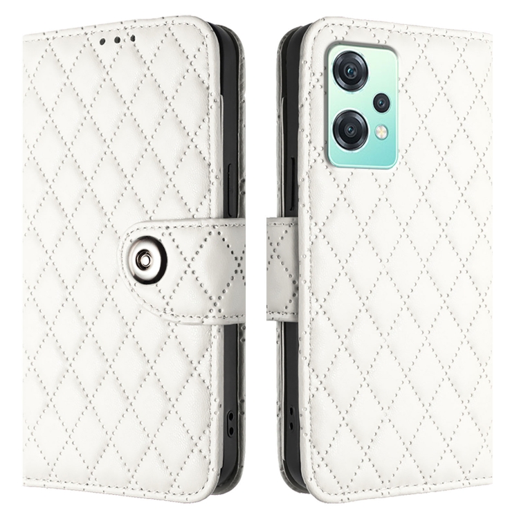 Funda de Cuero con Tapa y Textura Rombal para OnePlus Nord 2 Lite con Cordón (Blanco)