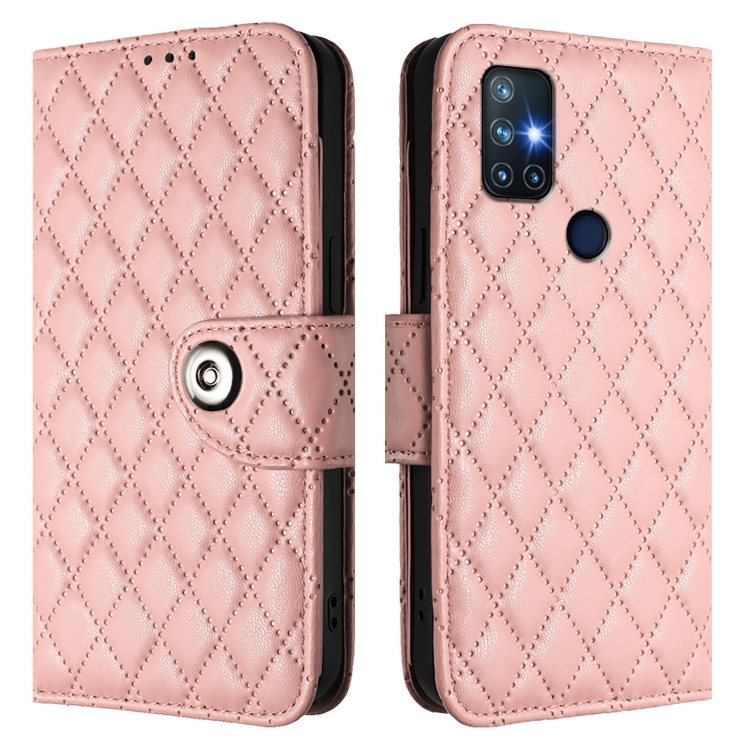 Funda de Cuero con Tapa y Textura Rombal para OnePlus Nord N10 5G con Cordón (Rosa Coral)