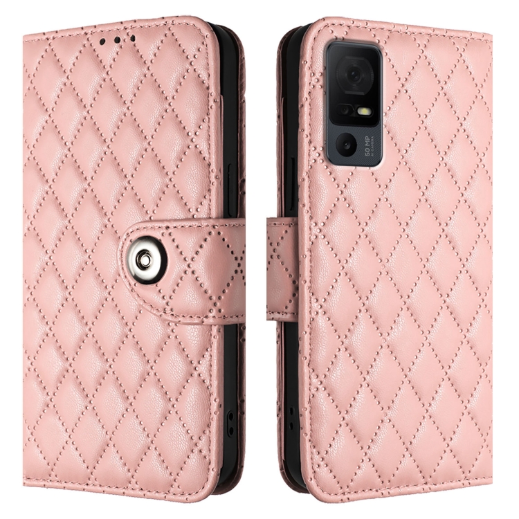 Funda de Cuero con Tapa y Textura Rombal para TCL 40 XL/40 T T608DL con Cordón (Rosa Coral)
