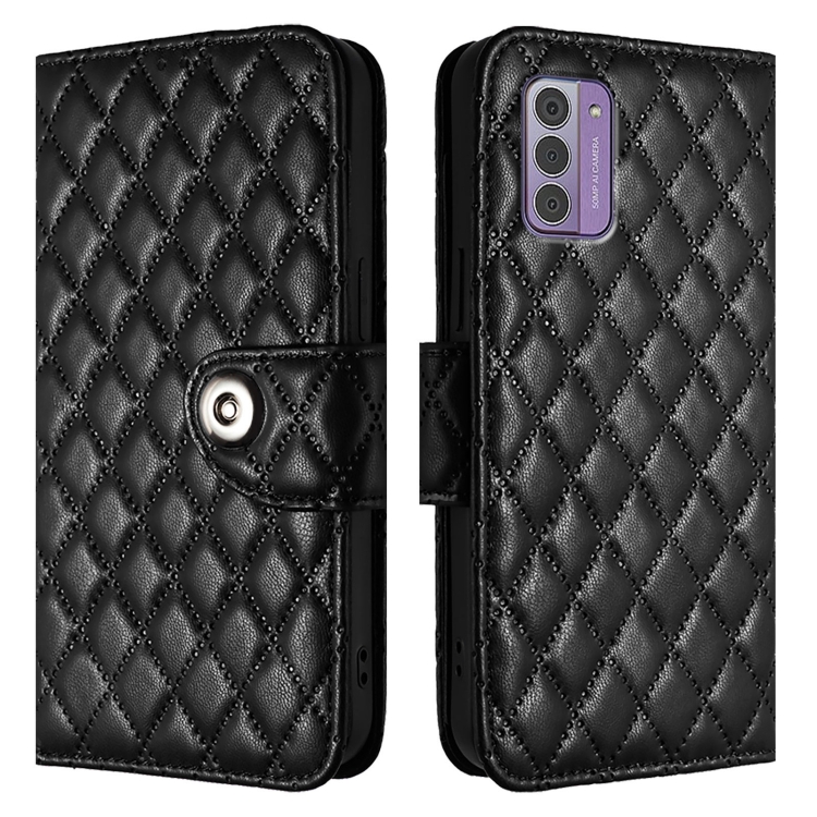 Funda de Cuero con Tapa y Textura Rómbica para Nokia G42/G310 con Cordón (Negro)