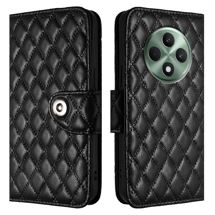 Funda de Cuero con Tapa y Textura Rómbica para Teléfono Oppo Reno12 F 5G con Cordón (Negro)