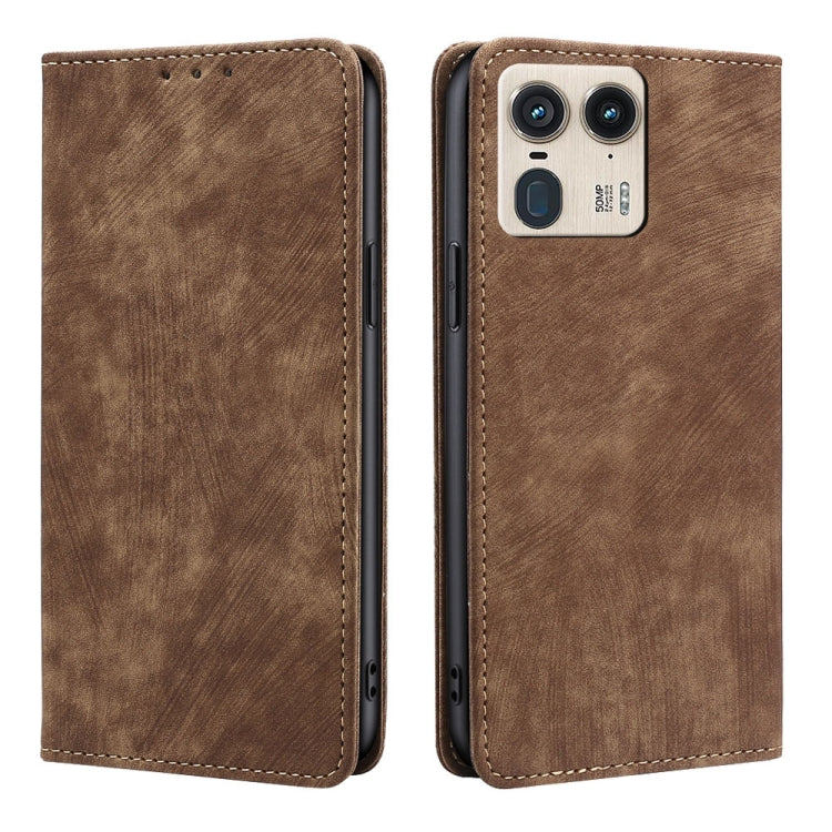 Funda de Cuero Magnética con Cepillo Antirrobo RFID para Motorola Edge 50 Ultra (Marrón)