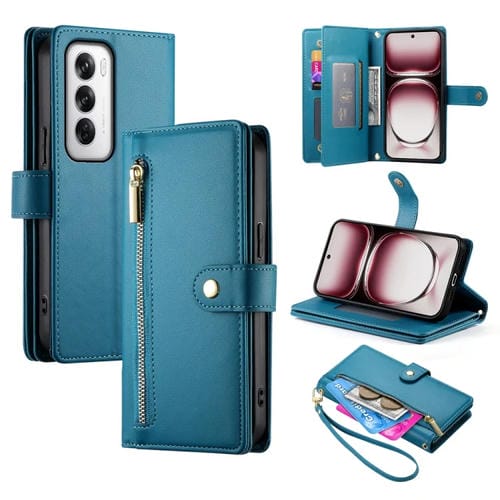 Funda de Cuero para Teléfono con Nueve Ranuras para Tarjetas y Cremallera para Oppo Reno12 Global (Azul)
