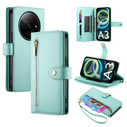 Funda de Cuero para Teléfono Redmi A3 con Nueve Ranuras para Tarjetas y Cremallera (Verde Menta)