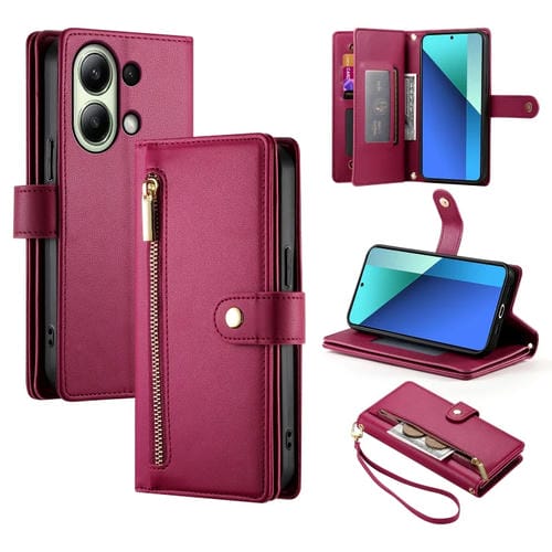 Funda de Cuero para Teléfono Redmi Note 13 4G con Nueve Ranuras para Tarjetas y Cremallera (Rojo)