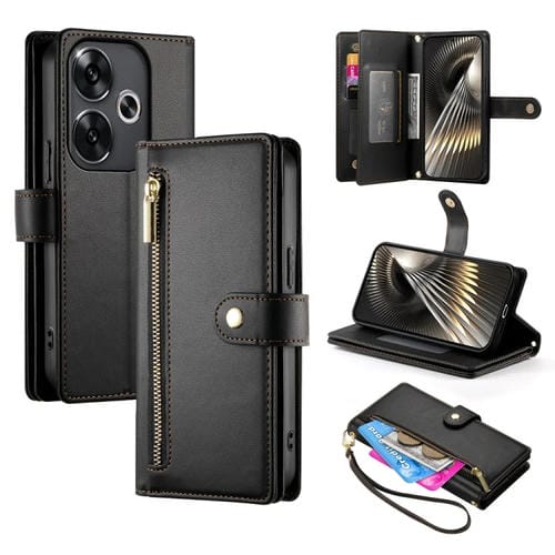 Funda de Cuero para Teléfono Redmi Turbo 3 con Nueve Ranuras para Tarjetas y Cremallera (Negra)