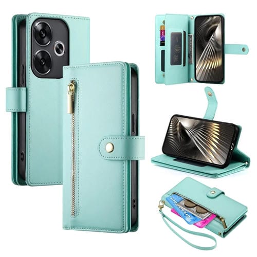 Funda de Cuero para Teléfono Redmi Turbo 3 con Nueve Ranuras para Tarjetas y Cremallera (Verde Menta)